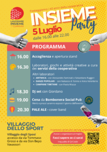 L’INSIEME Party si svolgerà sabato 5 luglio presso il Villaggio dello Sport – Villaggio degli Sposi, dalle ore 16.00 alle ore 22.00.