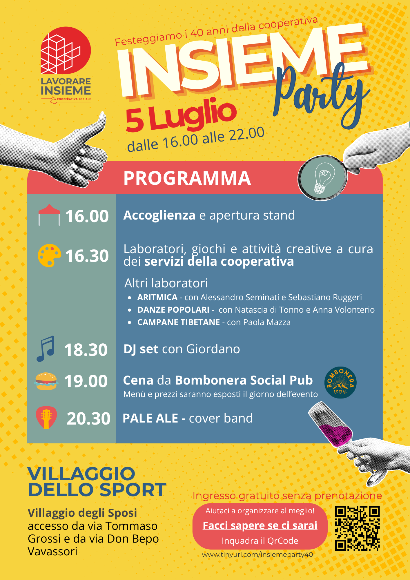 Il 2025 è un anno speciale per la Cooperativa Lavorare Insieme, che celebra i suoi 40 anni di attività. Per festeggiare questo importante traguardo, sabato 5 luglio si terrà il secondo appuntamento dedicato a tutta la comunità della cooperativa: l’INSIEME Party, una festa pensata per riconoscere e valorizzare il lavoro, la creatività e la passione di tutte le persone che ogni giorno danno vita ai servizi della cooperativa.