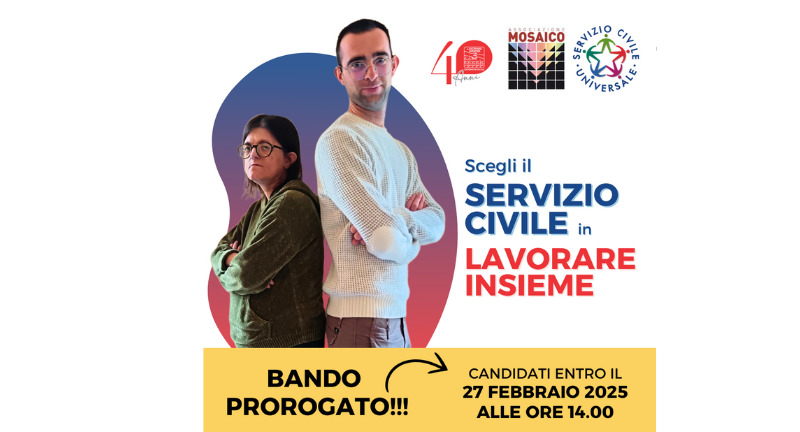 È stato prorogato al 27 febbraio 2025 ore 14.00 il termine per presentare la propria candidatura per svolgere il servizio civile in Lavorare Insieme.
